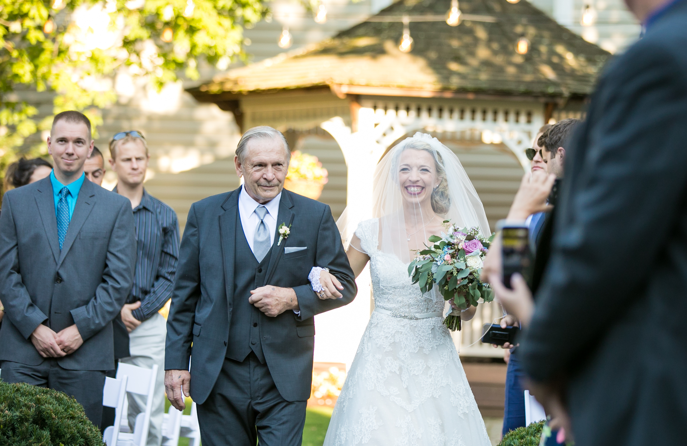 I always loved birdcage veils and was honestly on the fence about getting one. I ended up choosing a two-tiered blusher veil that was the perfect in-between. It also had tear drop crystals on the edges, which was a beautiful, extra touch. I do also love cathedral veils, but preferred to accent my dress and not overpower it, since there was already so much lace and detail on the body of the dress. I chose to wear a headband, as well, because it added something extra and was a sparkly addition once I took my veil off for the reception. Although veils can be expensive, I think they are a lovely accessory because they look beautiful in photos, help a bride feel feminine and classic during the ceremony, and come in a variety of styles to suit every personality and dress. Not to mention – the history behind veils is quite interesting. They helped the bride hide from evil spirits on her wedding day! (More on that in my book, a sweet keepsake for the bridal party).